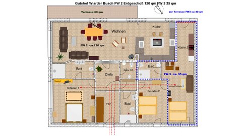 Ferienwohnung 2 Erdgeschoß (ca. 110 qm) mit direktem Zugang zur Terrasse und zum Garten. 2 Schlafzimmer mit Doppelbett mit separaten Bädern und großzügiger Duschkabine, das größere Schlafzimmer verfügt zusätzlich über ein Klappbett, auf Anfrage kann ein Klein-Kinderbett dazugestellt werden.